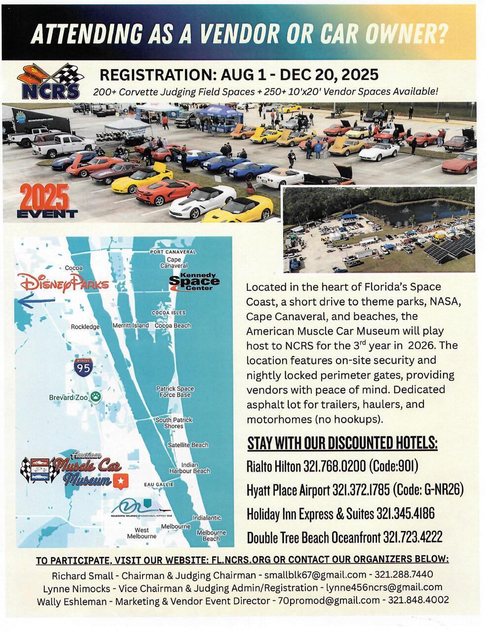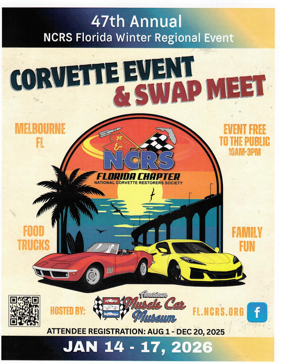 The annual Florida Winter Regional will include NCRS schools, a large swap meet & vendor area, food trucks, and entrance into the museum. The annual Florida Chapter Members Meeting will be held at this event.